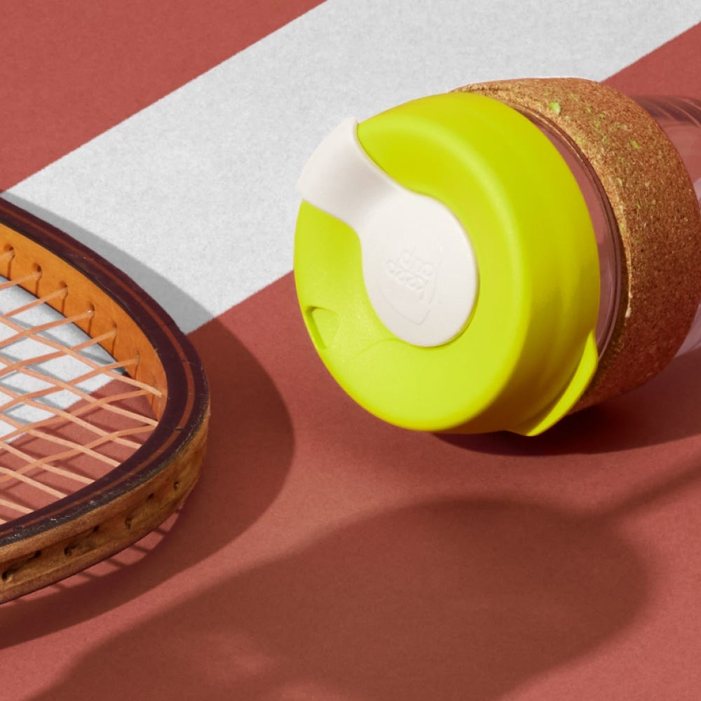 For the sustainable tennis lover in your life! Our best selling Brew Cork tempered glass reusable coffee cup with Grand Slam in recycling - using a 100% recycled tennis ball and cork band. The tiny flecks of bright material add interest and texture to the band. A great choice for a post-match celebratory beverage!
