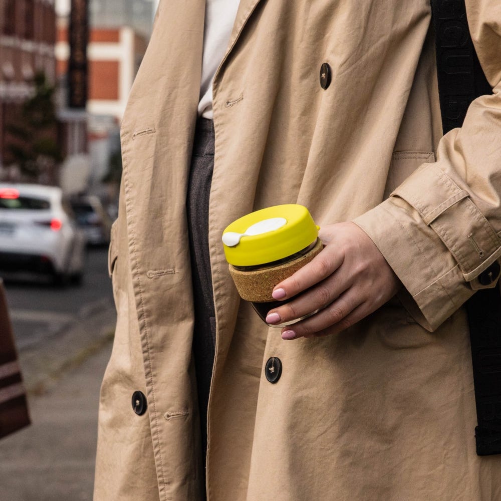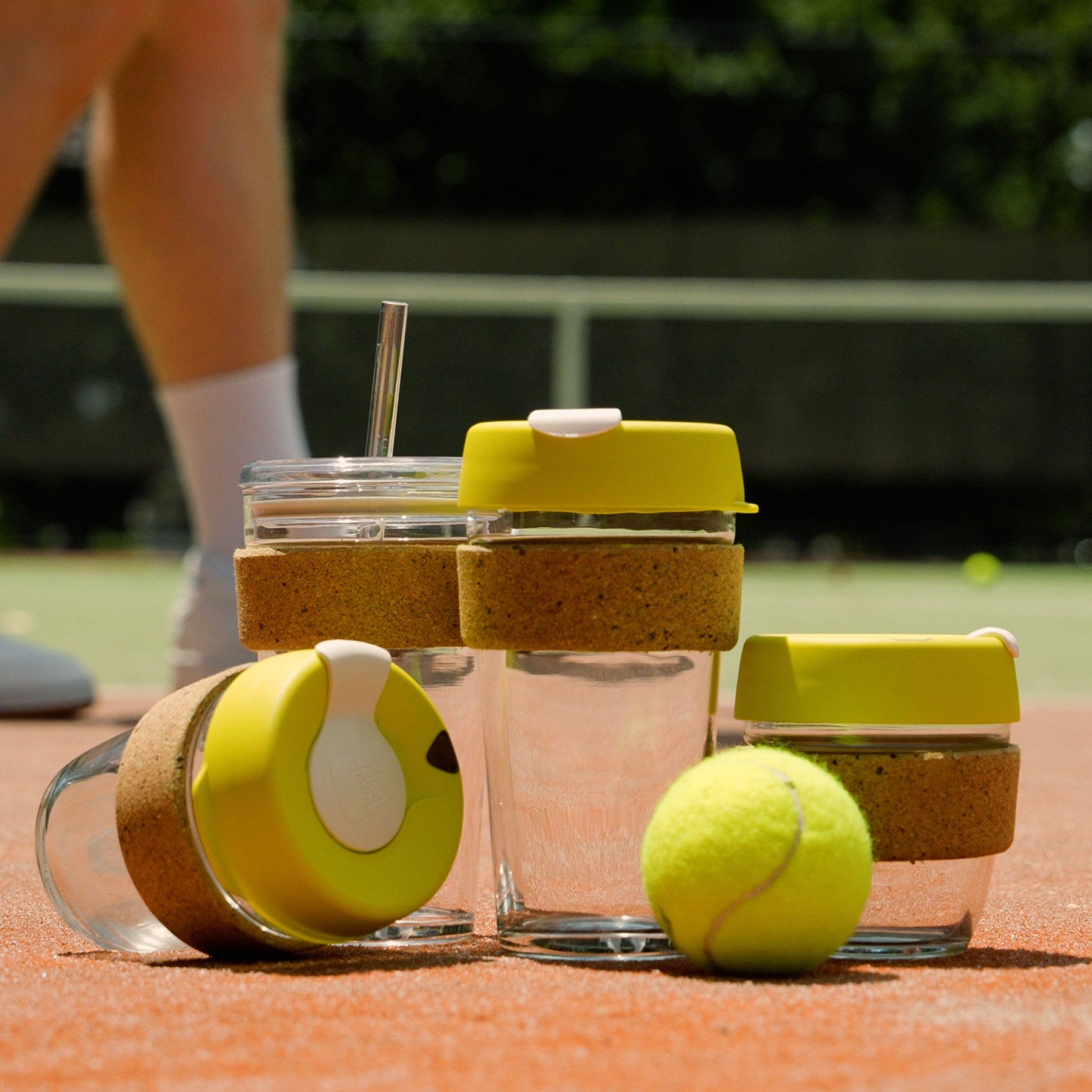 For the sustainable tennis lover in your life! Our best selling Brew Cork tempered glass reusable coffee cup with Grand Slam in recycling - using a 100% recycled tennis ball and cork band. The tiny flecks of bright material add interest and texture to the band. A great choice for a post-match celebratory beverage!